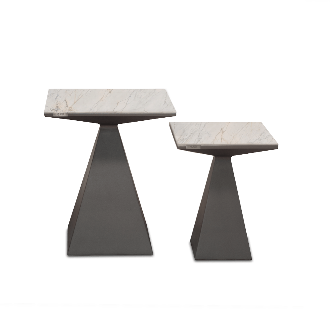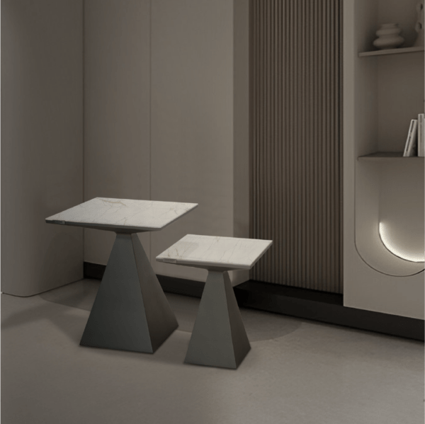El diseño cuadrado del top en piedras exclusivas como porcelanato o dekton brinda elegancia al espacio. Mientras que el ángulo de la base realza el diseño haciéndola única. Combina dos Frato de distintos tamaños para un juego de alturas en tu sala.